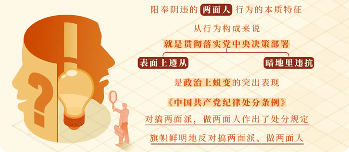 陽(yáng)奉陰違的兩面人行為的本質(zhì)特征,從行為構(gòu)成來(lái)說(shuō),就是貫徹落實(shí)黨中央決策部署表面上遵從,暗地里違抗,是政治上蛻變的突出表現(xiàn)。