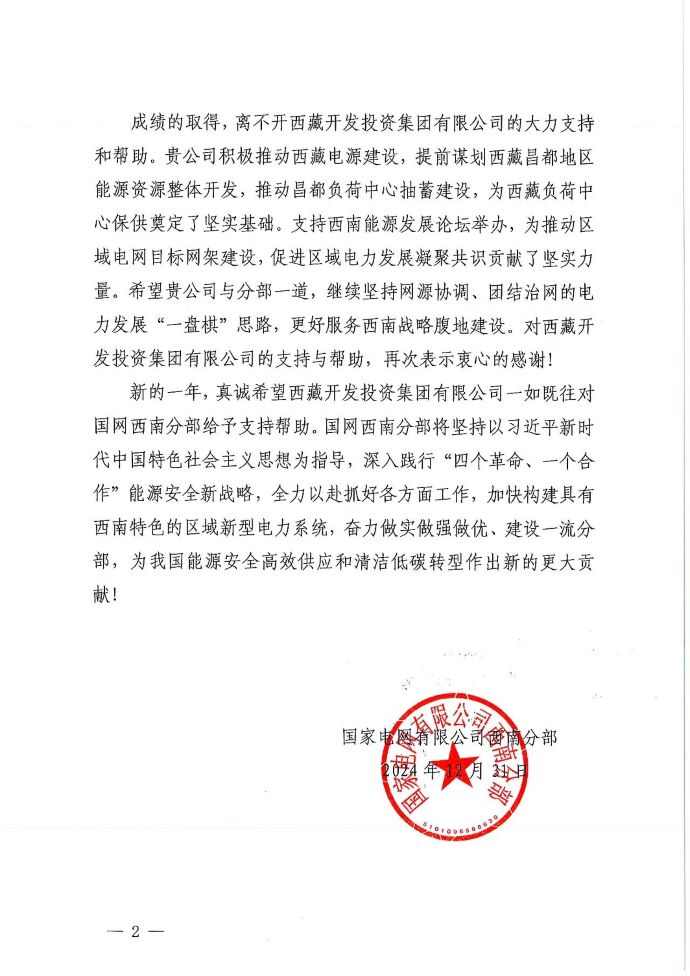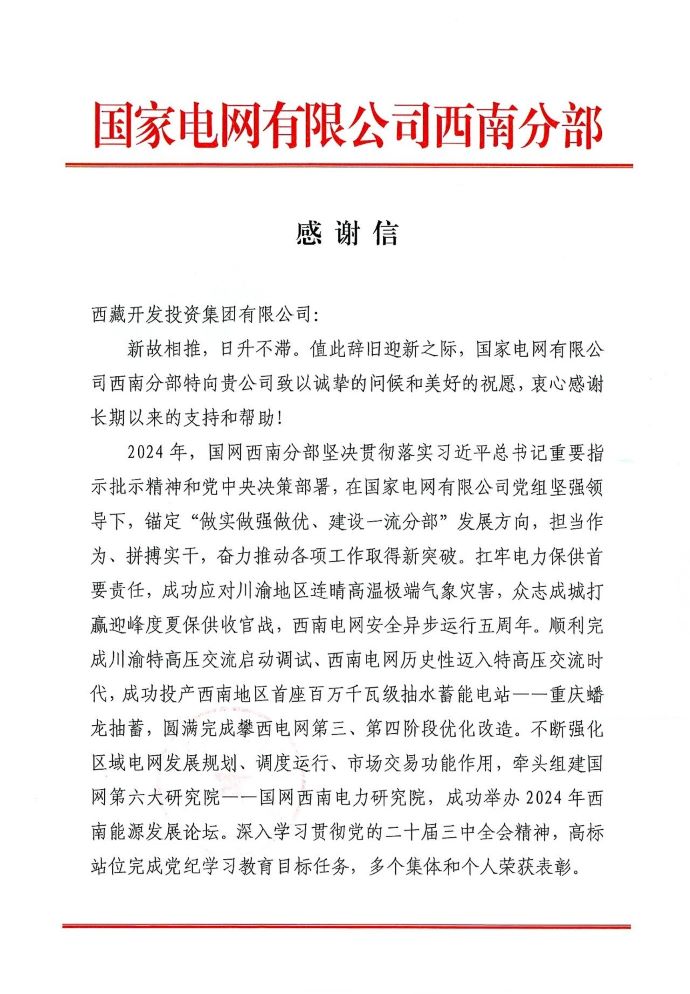 新年伊始,西藏開投集團收到來自國網(wǎng)電力有限公司西南分部的一封感謝信,對集團積極推動西藏電源建設,提前謀劃西藏昌都地區(qū)能源資源整體開發(fā),推動昌都負荷中心抽蓄建設,以及支持西南能源發(fā)展論壇舉辦,推動區(qū)域電網(wǎng)目標網(wǎng)架建設,促進區(qū)域電力發(fā)展凝聚共識作出的貢獻表示感謝。