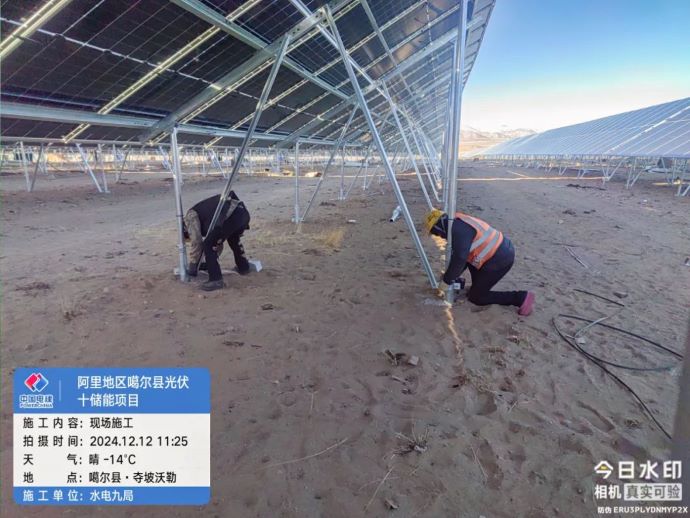 ▲噶爾光伏發(fā)電項(xiàng)目,現(xiàn)場(chǎng)施工人員加固光伏板支架。