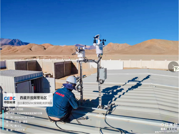 ▲日土光伏項(xiàng)目,現(xiàn)場(chǎng)施工人員開展光功率預(yù)測(cè)環(huán)境檢測(cè)儀安裝作業(yè)。