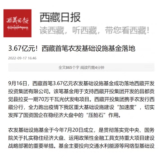 9月16日,西藏首筆3.67億元農(nóng)發(fā)基礎(chǔ)設(shè)施基金成功落地西藏開發(fā)投資集團有限公司。該筆基金用于支持西藏開投集團開發(fā)的昌都貢覺縣拉妥一期70萬千瓦光伏發(fā)電項目,是目前西藏自治區(qū)唯一一筆落地基金項目。西藏開投集團攜手農(nóng)發(fā)行西藏分行,全力跑出疫情下我區(qū)重大基礎(chǔ)設(shè)施建設(shè)“加速度”,切實發(fā)揮了國資國企在穩(wěn)經(jīng)濟大盤中的“壓艙石”作用。