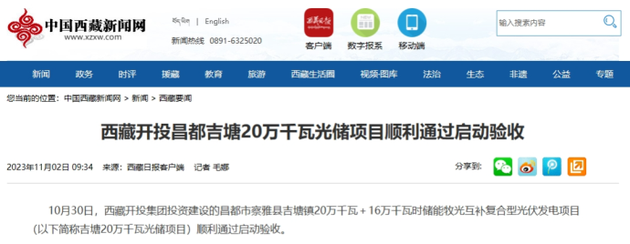 人民網(wǎng)、中國(guó)西藏新聞網(wǎng)、西藏日?qǐng)?bào)客戶端報(bào)道了《西藏開(kāi)投昌都吉塘20萬(wàn)千瓦光儲(chǔ)項(xiàng)目順利通過(guò)啟動(dòng)驗(yàn)收》