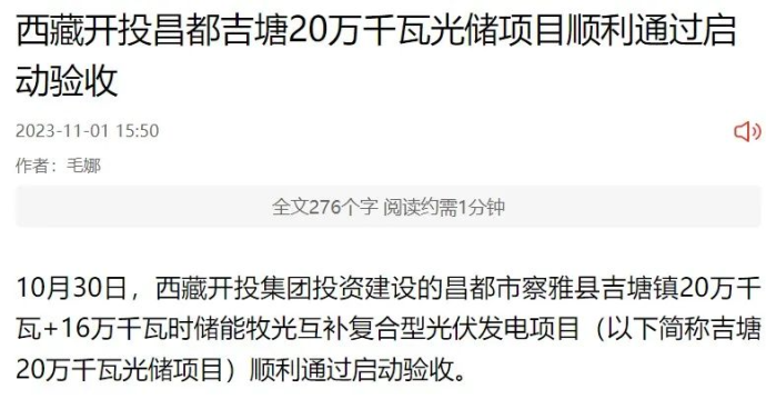 編者按:11月1-2日,人民網(wǎng)、中國(guó)西藏新聞網(wǎng)、西藏日?qǐng)?bào)客戶端報(bào)道了《西藏開(kāi)投昌都吉塘20萬(wàn)千瓦光儲(chǔ)項(xiàng)目順利通過(guò)啟動(dòng)驗(yàn)收》。全文如下: