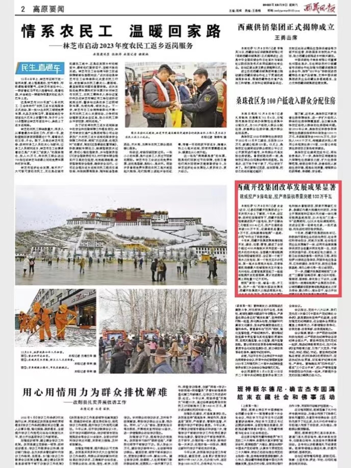 編者按:12月9日,西藏日?qǐng)?bào)第二版高原要聞欄目報(bào)道了《西藏開(kāi)投集團(tuán)改革發(fā)展成果顯著建成投產(chǎn)9座電站,投產(chǎn)總裝機(jī)容量突破100萬(wàn)千瓦》文章。全文如下: