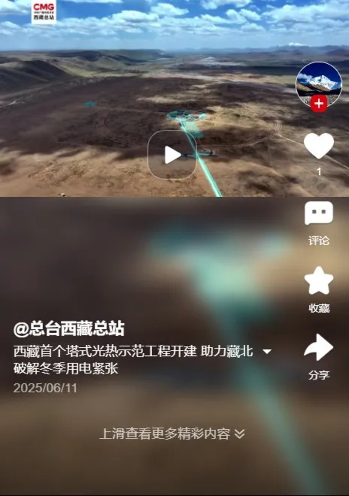 6月10日,全球海拔最高、西藏首個塔式光熱項目——西藏開投安多土碩100MW光熱電站正式開工建設(shè)的消息,被人民網(wǎng)、新華網(wǎng)、央視、光明日報、經(jīng)濟(jì)日報、科技日報、中國新聞網(wǎng)、中國西藏網(wǎng)、中國發(fā)展網(wǎng)、西藏發(fā)布、西藏日報、西藏廣播電視臺、西藏商報、安多縣廣播電視臺等各級媒體平臺宣傳報道,有力提升了集團(tuán)品牌影響力和產(chǎn)業(yè)發(fā)展的傳播力。