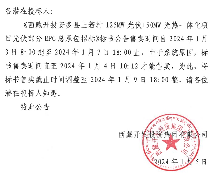 關(guān)于延長《西藏開投安多縣土若村125MW光伏+50MW光熱一體化項目光伏部分EPC總承包招標(biāo)》標(biāo)書售賣時間的公告