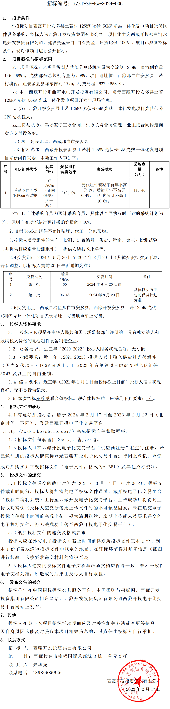 西藏開投安多縣土若村125MW光伏+50MW光熱一體化發(fā)電項目光伏組件設(shè)備采購招標公告