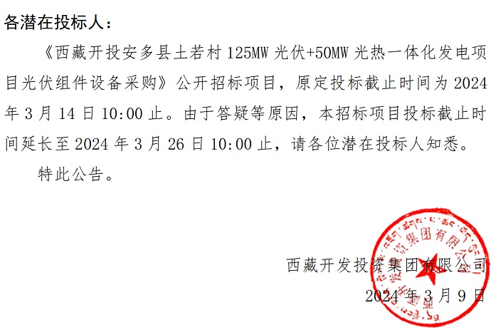 一體化發(fā)電項(xiàng)目光伏組件設(shè)備采購》投標(biāo)截止時間的公告
