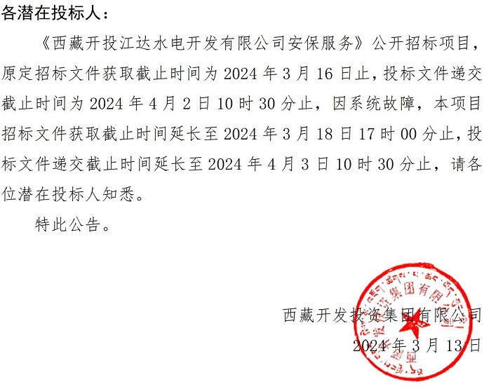 關(guān)于延長《西藏開投江達水電開發(fā)有限公司安保服務(wù)》招標文件
